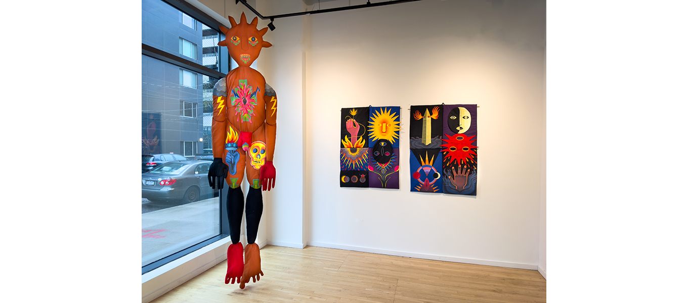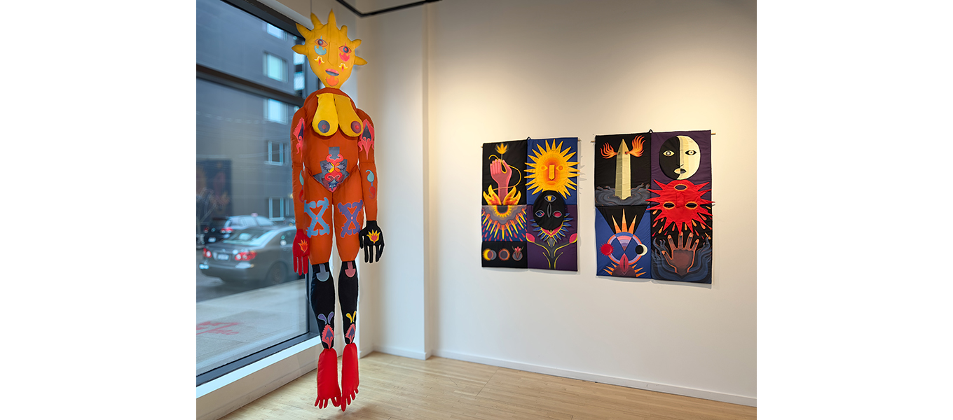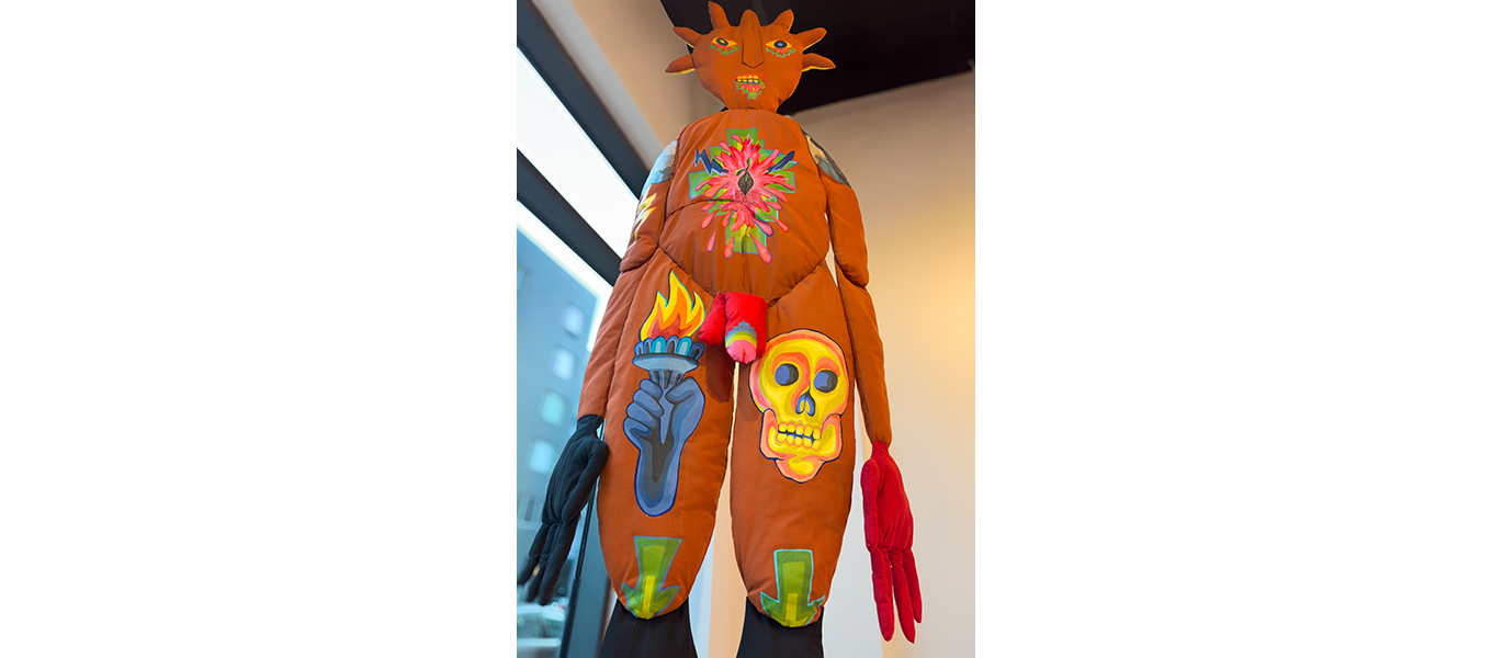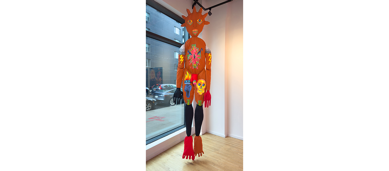 ClothBody es una pieza textil que encarna un cuerpo simultáneamente masculino y femenino. Su superficie está intervenida con formas geométricas florales inspiradas en los textiles del pueblo Lenape, originario de esta región de América del Norte. A esos patrones ancestrales se suman símbolos propios de la ciudad contemporánea, como la mano que sostiene la antorcha de la Estatua de la Libertad, junto con elementos que vengo explorando en obras anteriores, como la semilla y la calavera.