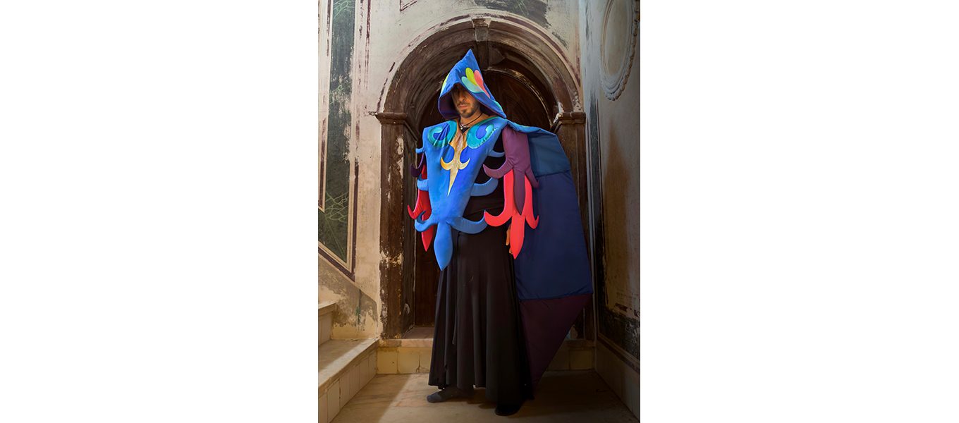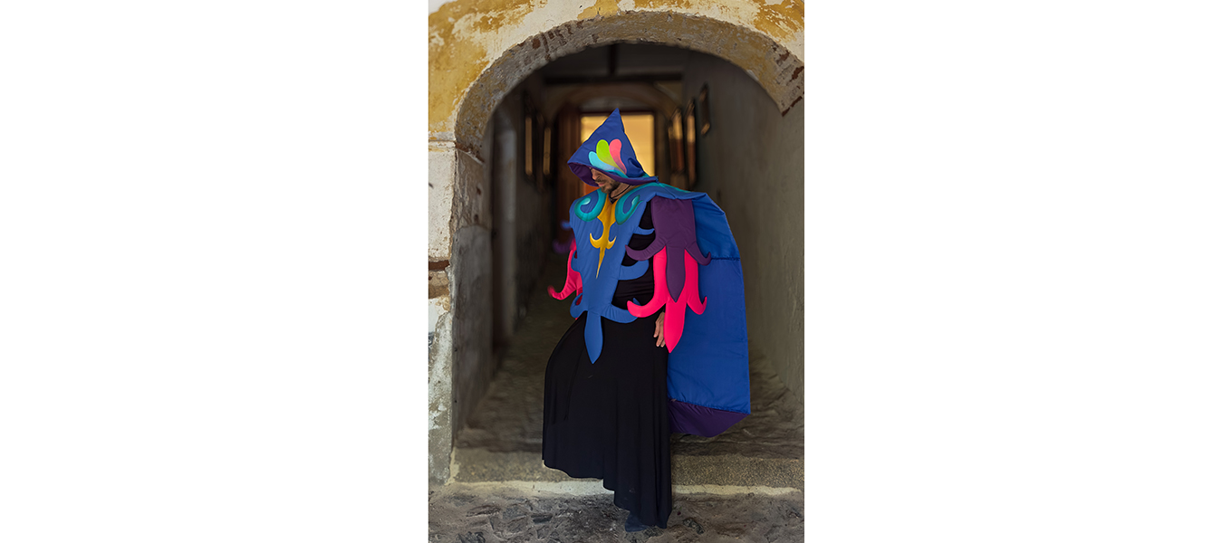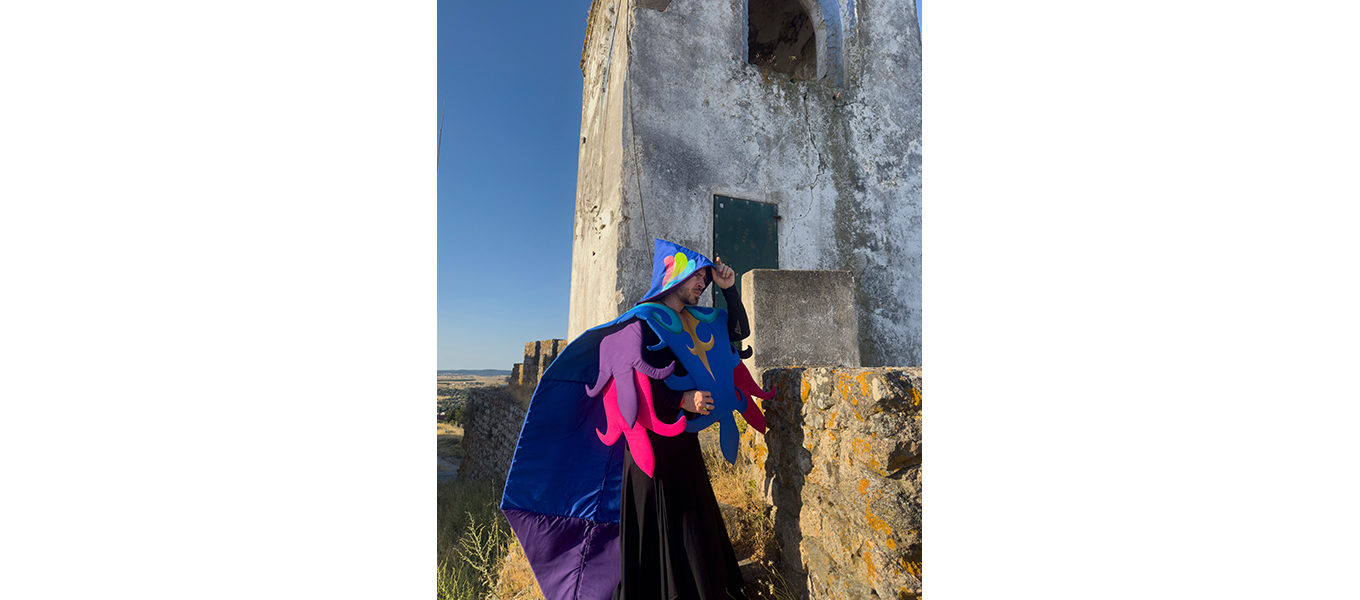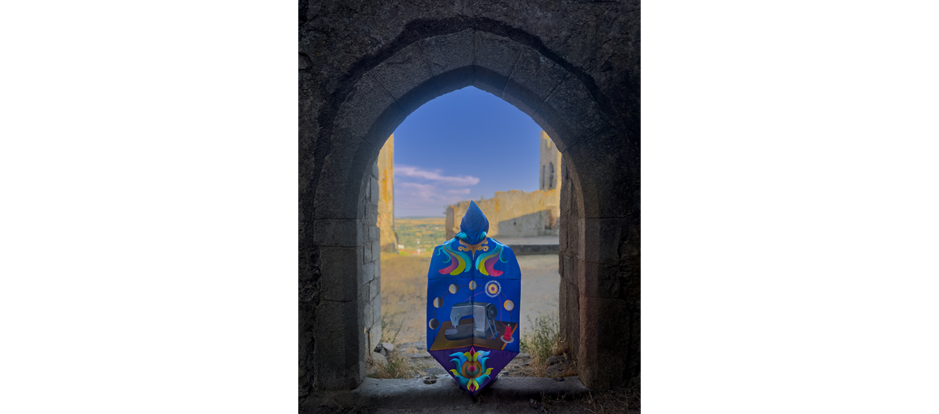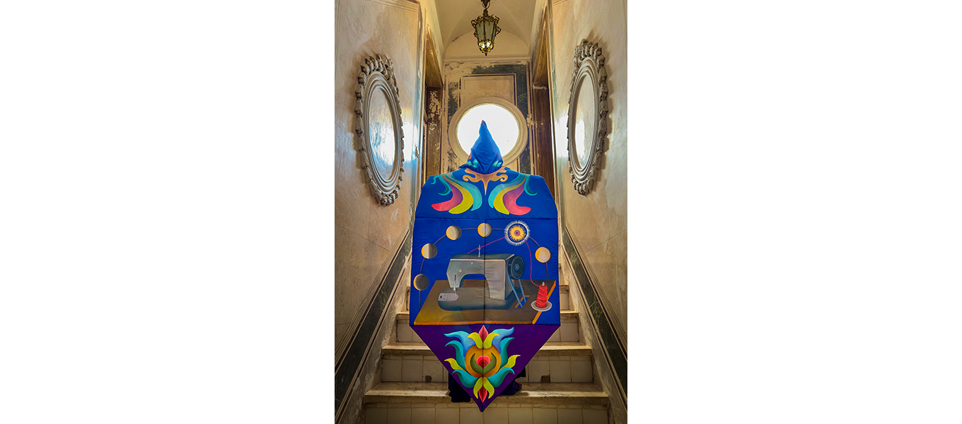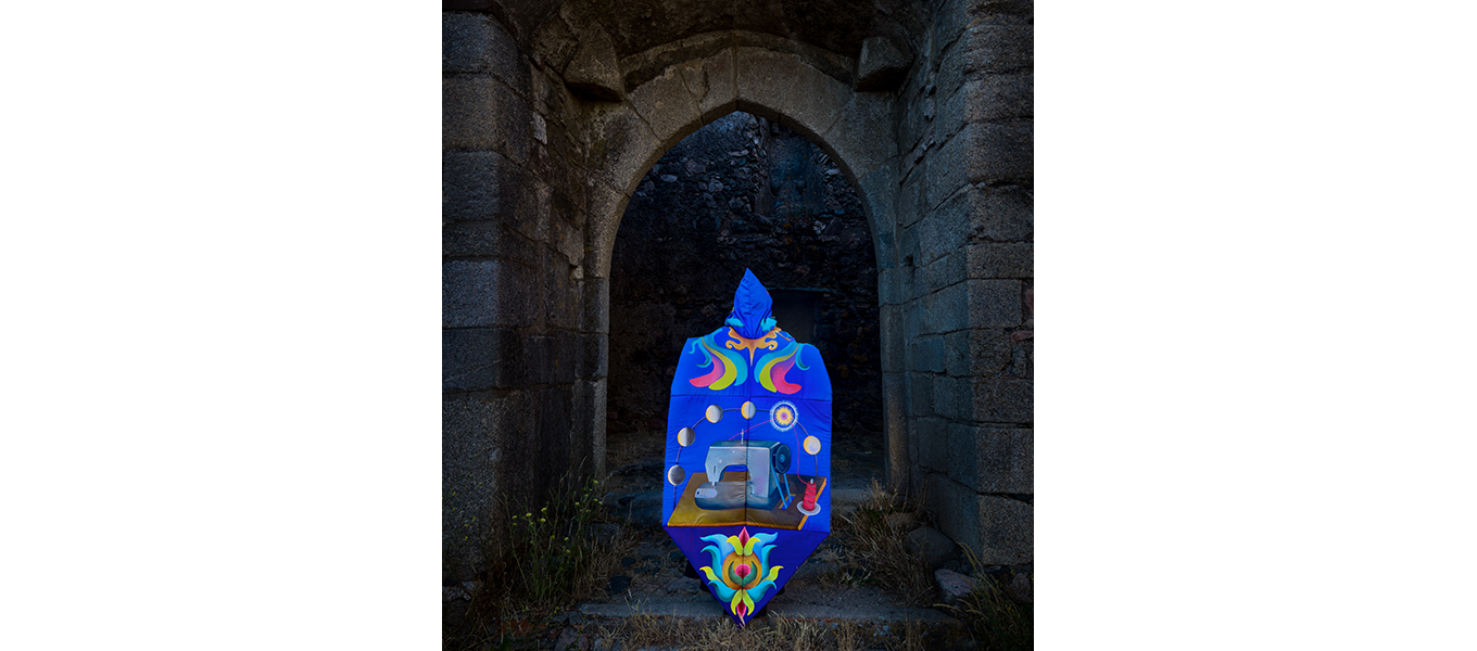 O Monge (El Monje) es una obra textil realizada en Arraiolos, Portugal, concebida para activarse a través de una acción performática. A partir de la referencia de los tapetes tradicionales de la región, la pieza se configura como un cuerpo-manto que reúne símbolos del bordado local con elementos contemporáneos de mi imaginario personal. Las formas geométricas, las flores estilizadas y los colores vibrantes dialogan con una máquina de coser ubicada en el centro: símbolo del hacer, del rito y del trabajo artesanal. Sobre ella se despliegan las fases de la luna, recordatorio de los ciclos naturales y de un tiempo circular que orienta los procesos de transformación y creación. Es una cosmogonía íntima, donde cada puntada acompaña el pulso de un calendario invisible que enlaza lo humano con lo celeste.